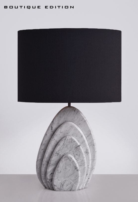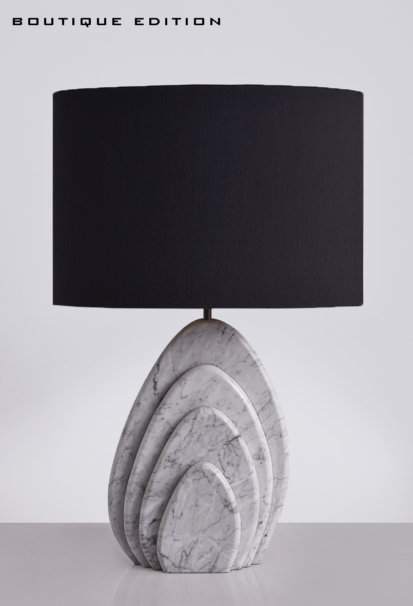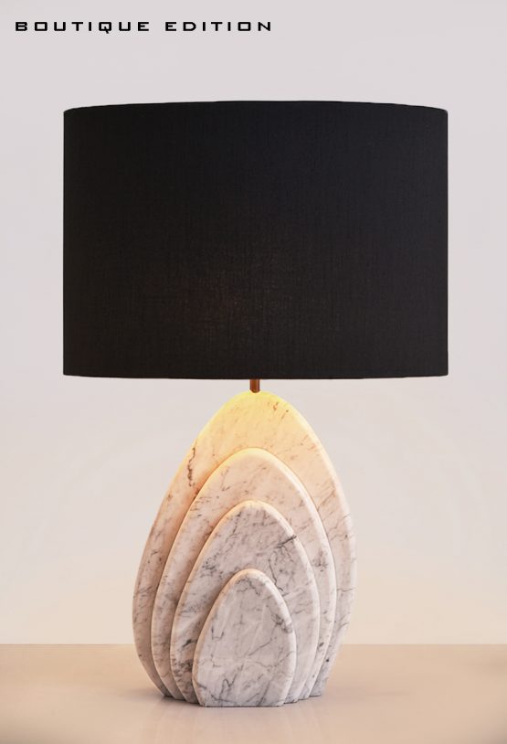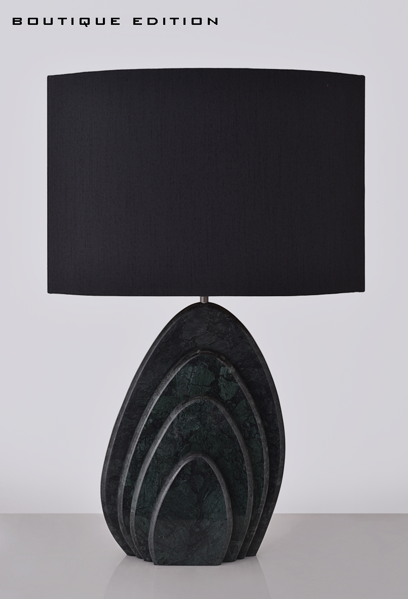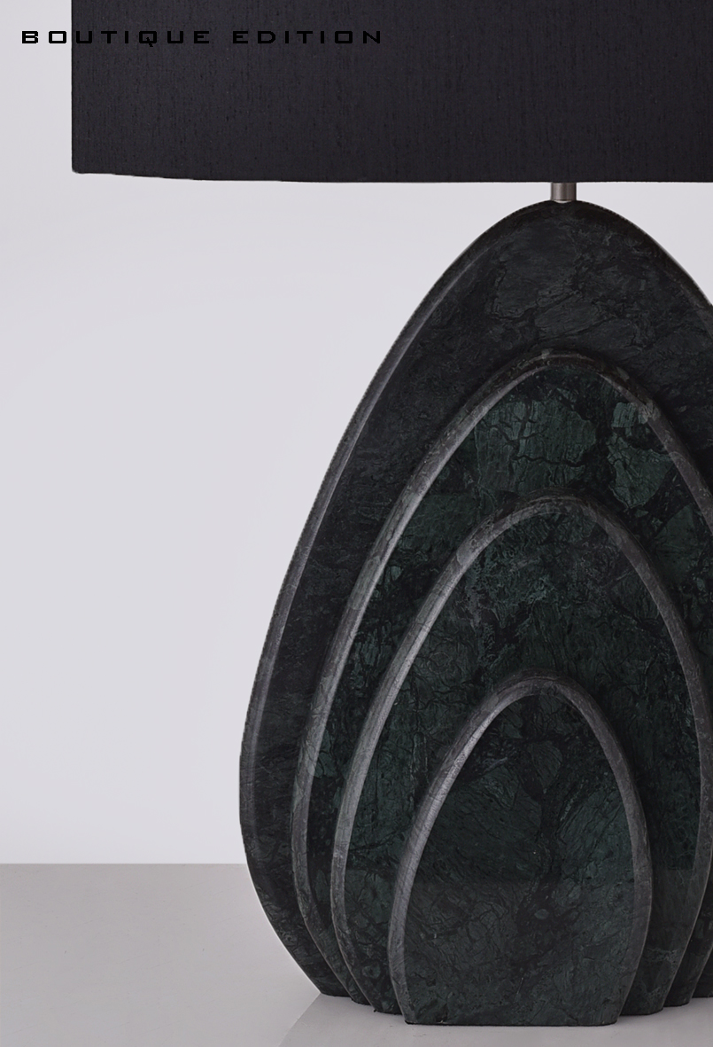 This contemporary handcrafted table lamp, the stand is composed of seven layers of marble. This table lamp features a sculptural design, its stand intricately carved from seven panels of rich green marble. Paired with a black linen shade and accented with delicate brass details, each piece offers a sense of understated luxury. The Oval table lamp is an ideal choice for the living room, or bedroom.