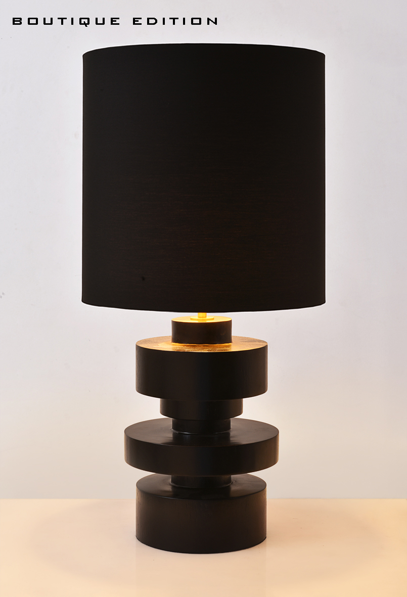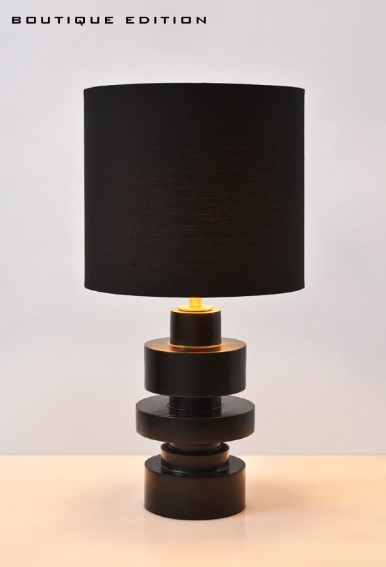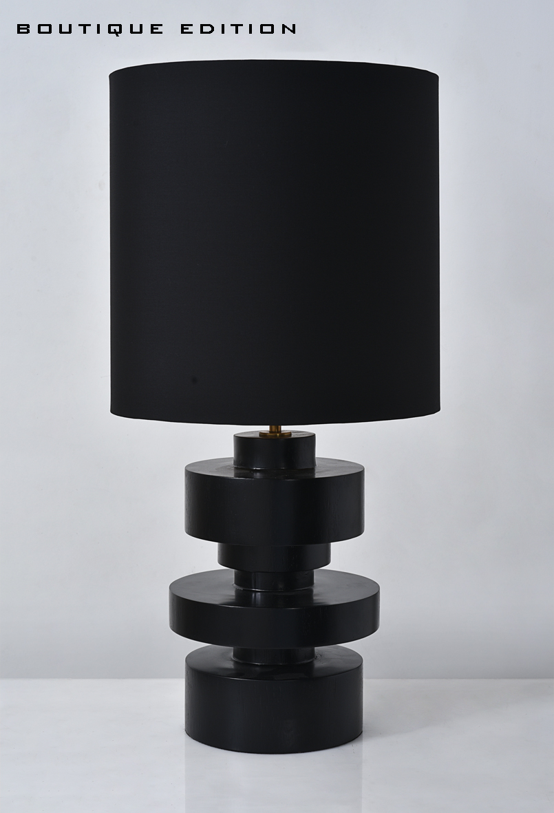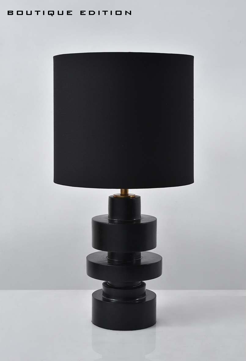 Mid-century modern wooden table lamp, with a stacked cylinder design. The Sierra table lamp features a stack of teak wood blocks finished in a deep black color. Its organic style shades are ideal for accenting a mid-century inspired bedroom or living room, while remaining luxurious and modern overall with the black polycotton shade. This table lamp is available in two different sizes to choose from