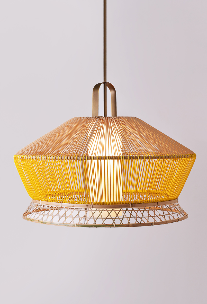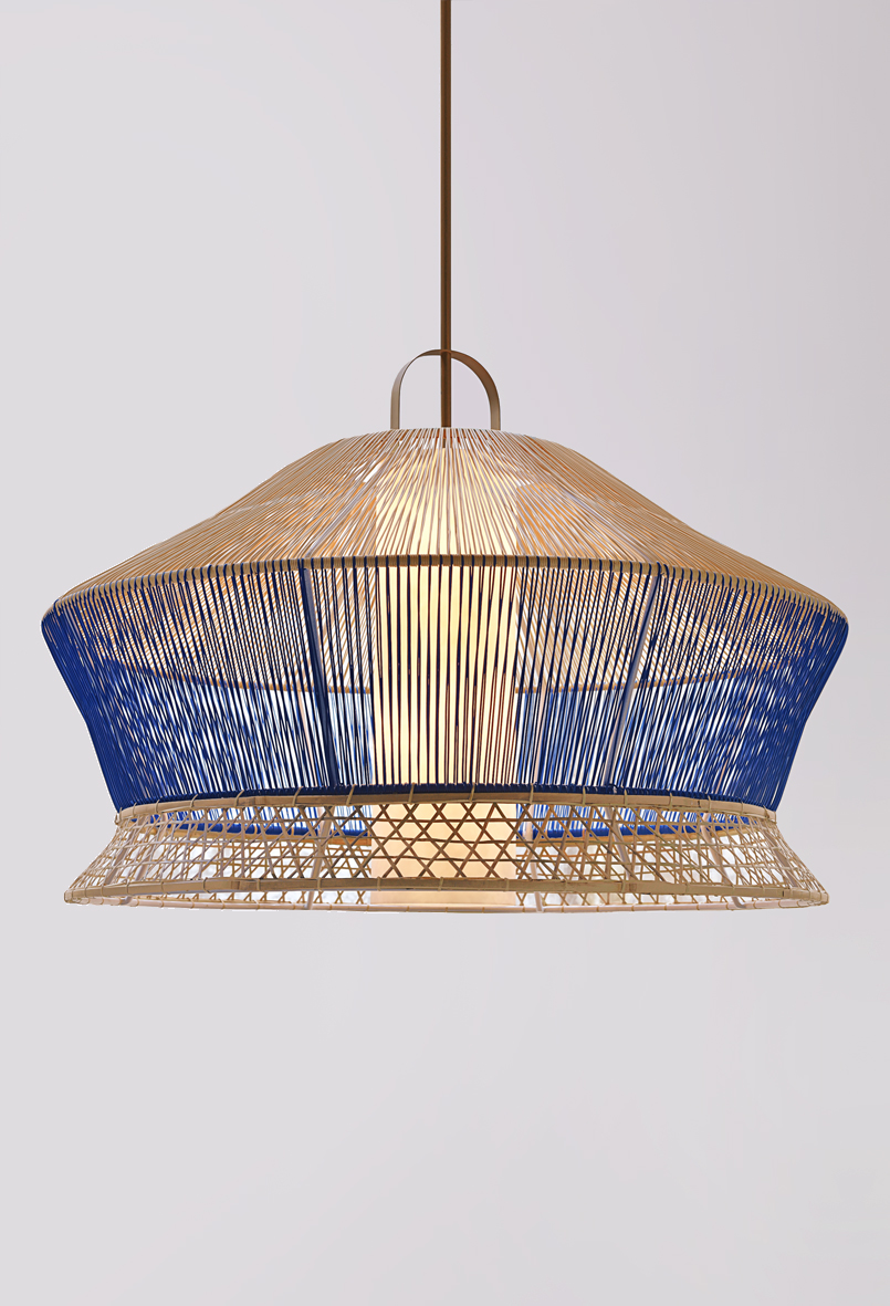 The Tribecca pendant lamp is a gorgeous piece that features two different weaving styles. It’s made from bamboo mixed with synthetic rattan in a combination of natural and dark blue or yellow colors, which really makes it stand out. The lamp also comes with a resin fiberglass shade, which helps to diffuse the light. And it’s available in two sizes, medium and large.